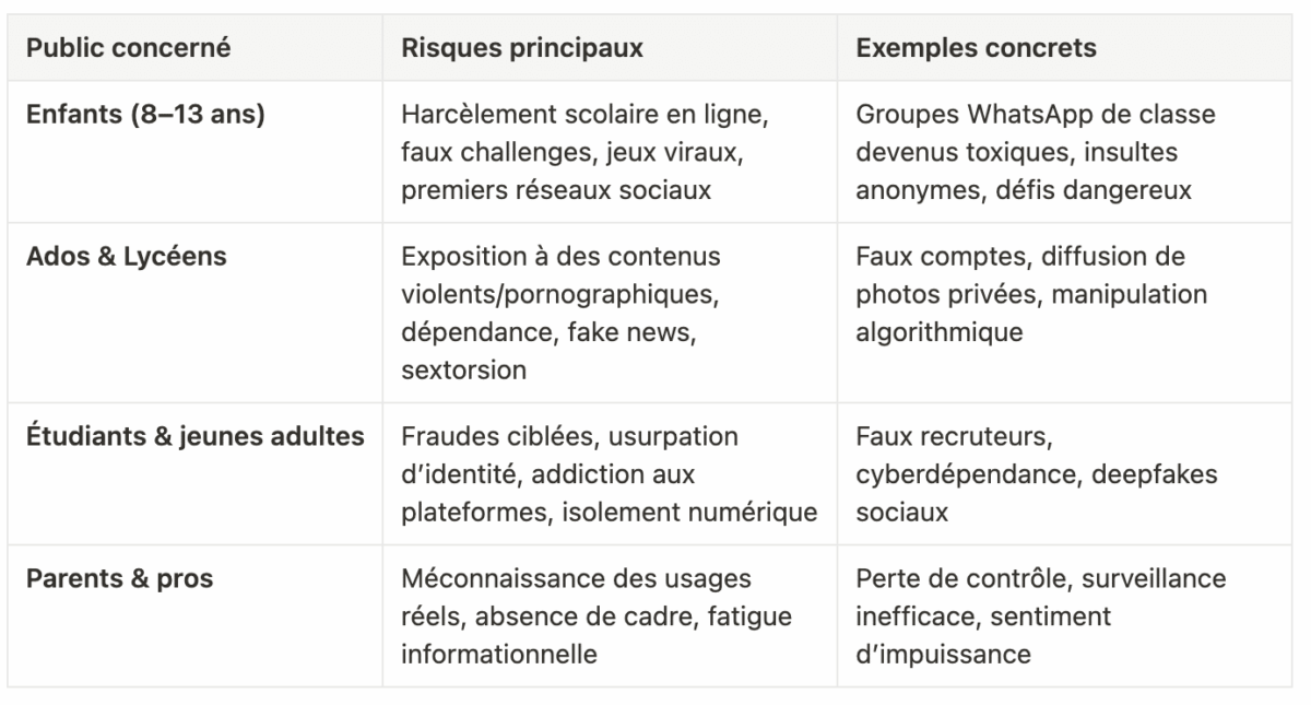 Cyberharcèlement, dépendance aux écrans, usurpation d’identité, contenus inadaptés, isolement social numérique, fatigue mentale…